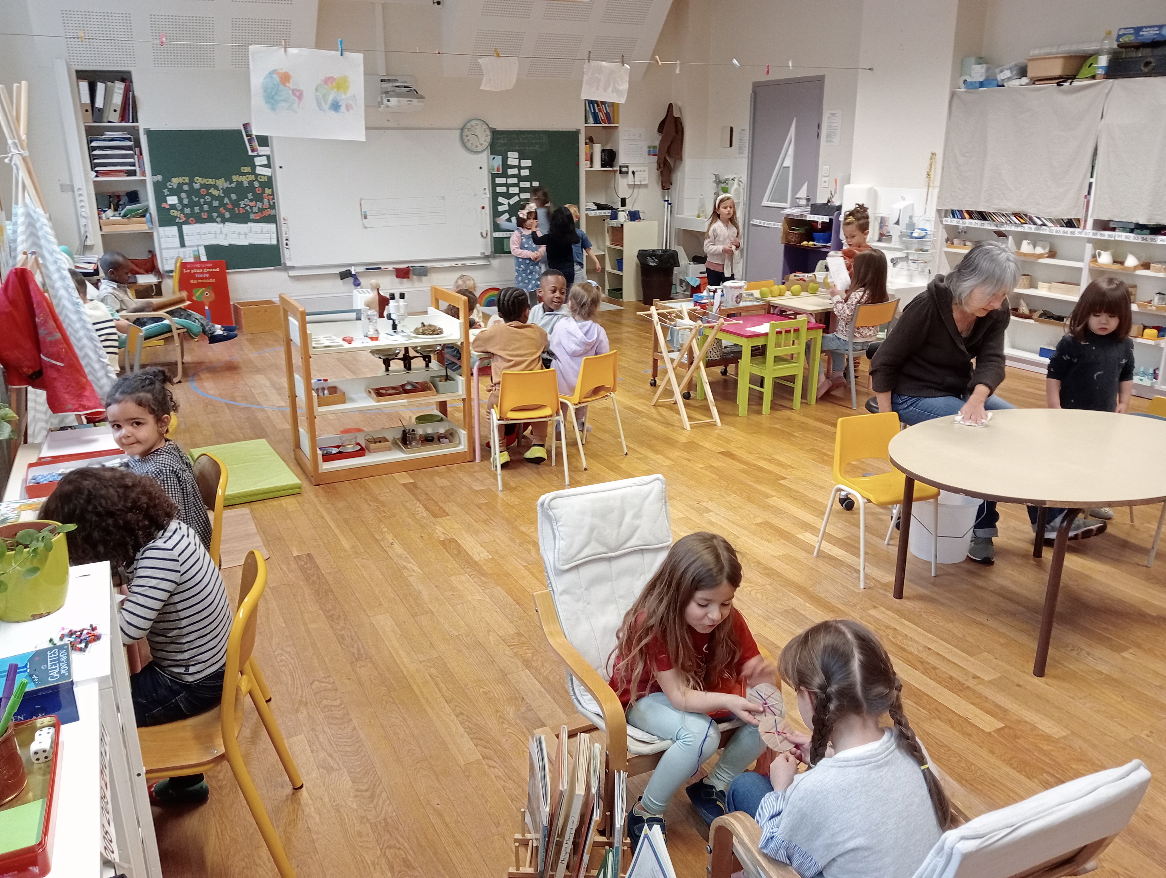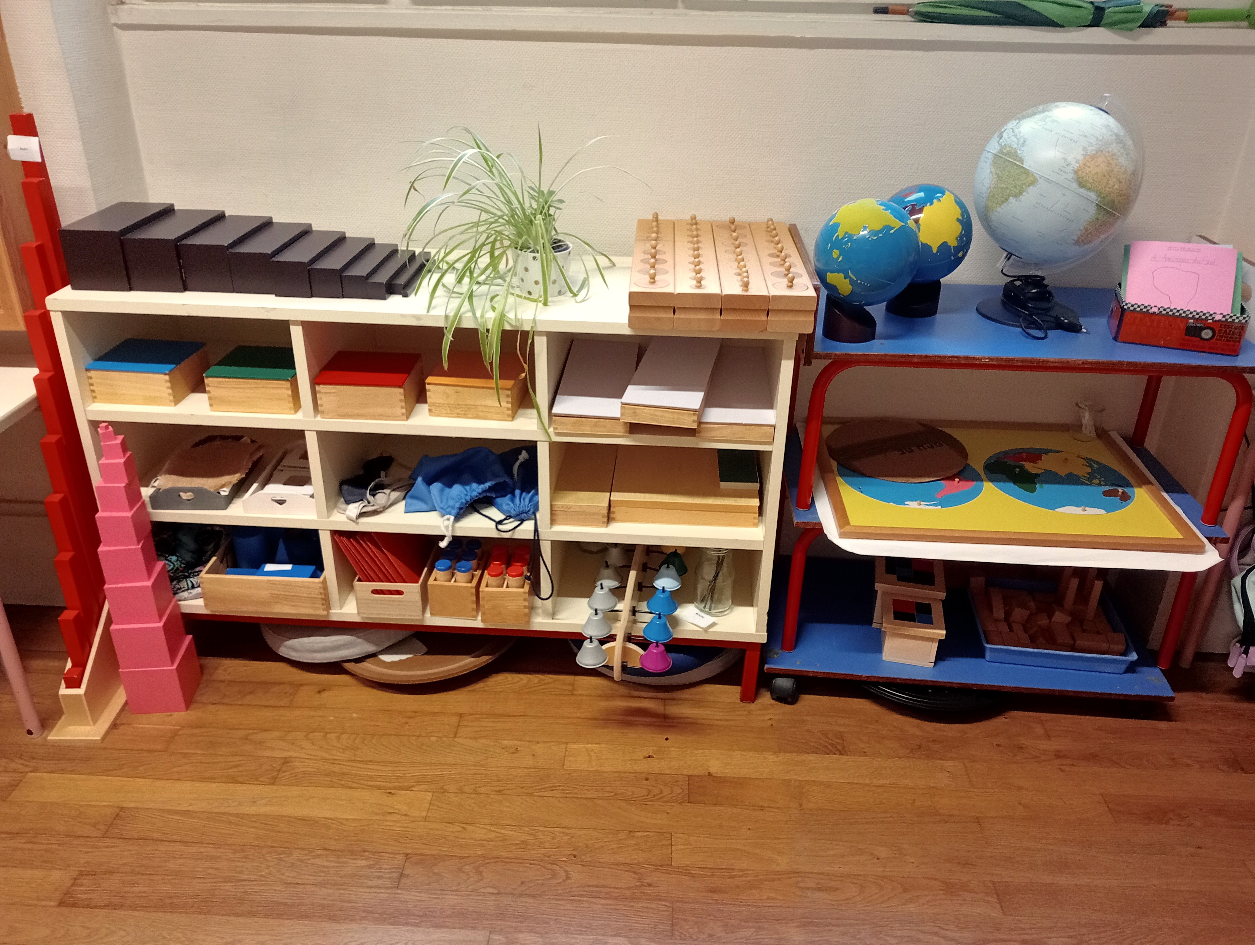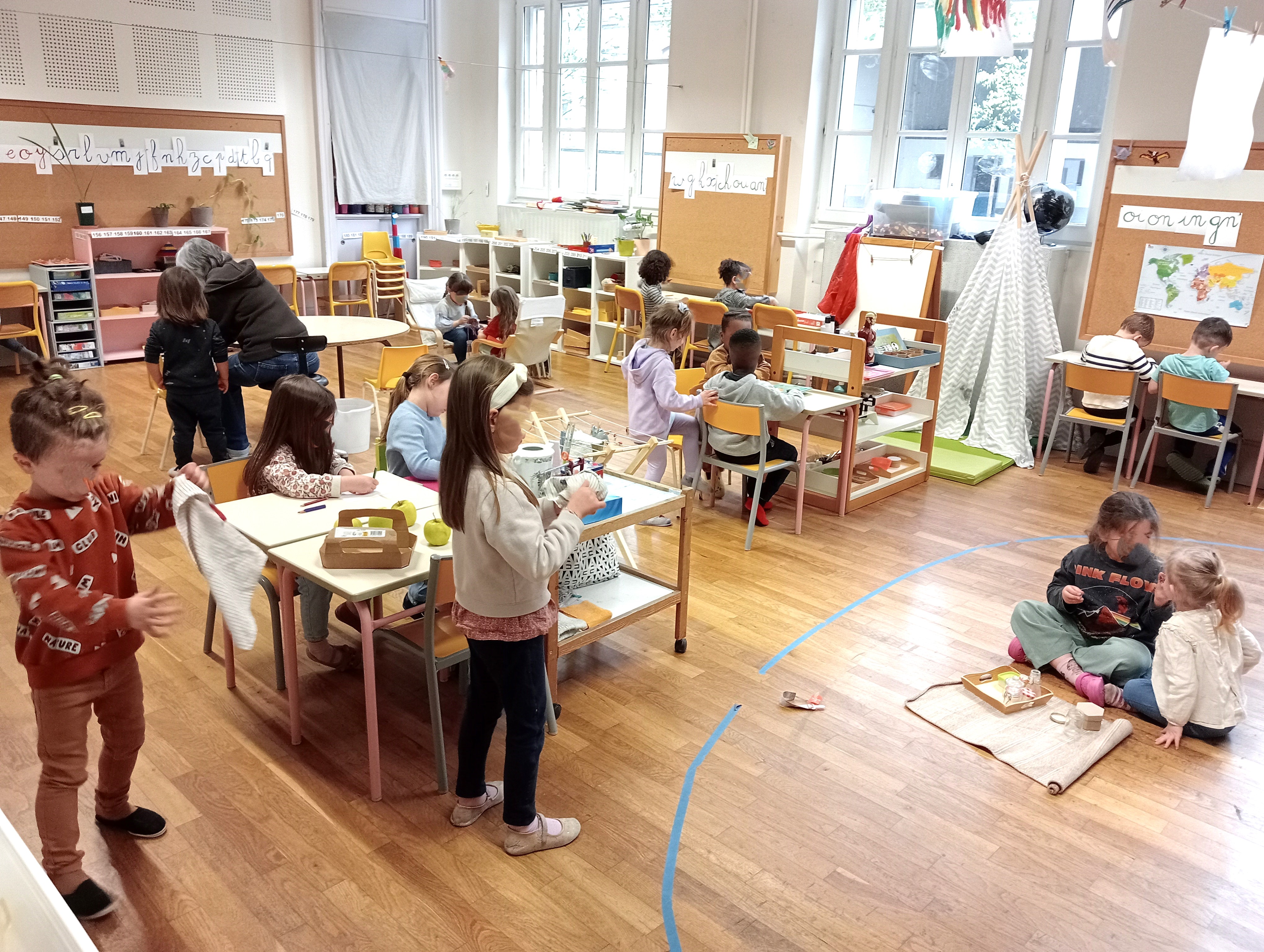 Auxquels il faut ajouter le meuble de phonologie (que vous verrez plus bas), et ceux de préparation à l’écriture, d’Arts manuels, et d’espace et logique. La classe est dégagée pour permettre une circulation aisée, et les enfants ont le choix de travailler sur table ou sur un tapis au sol.