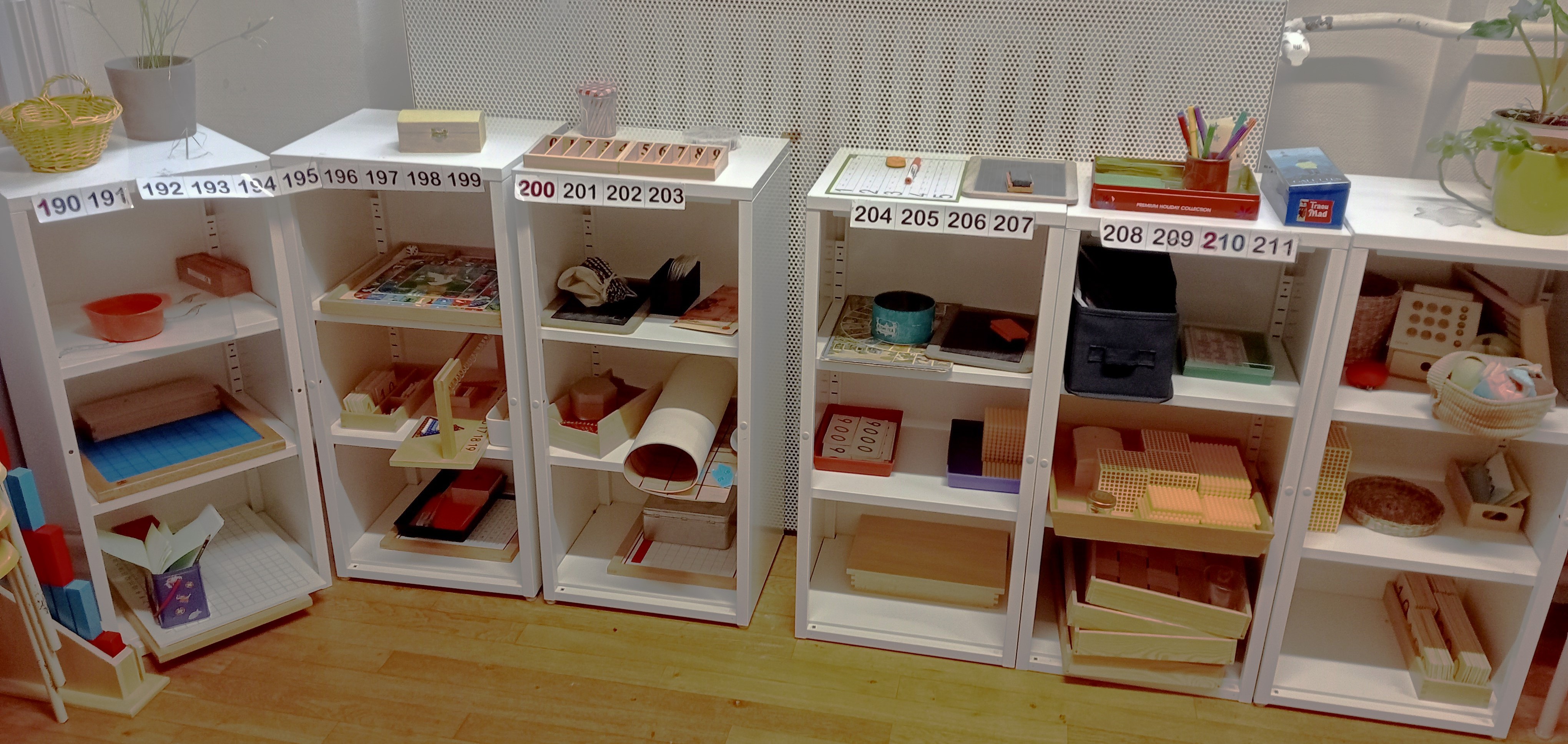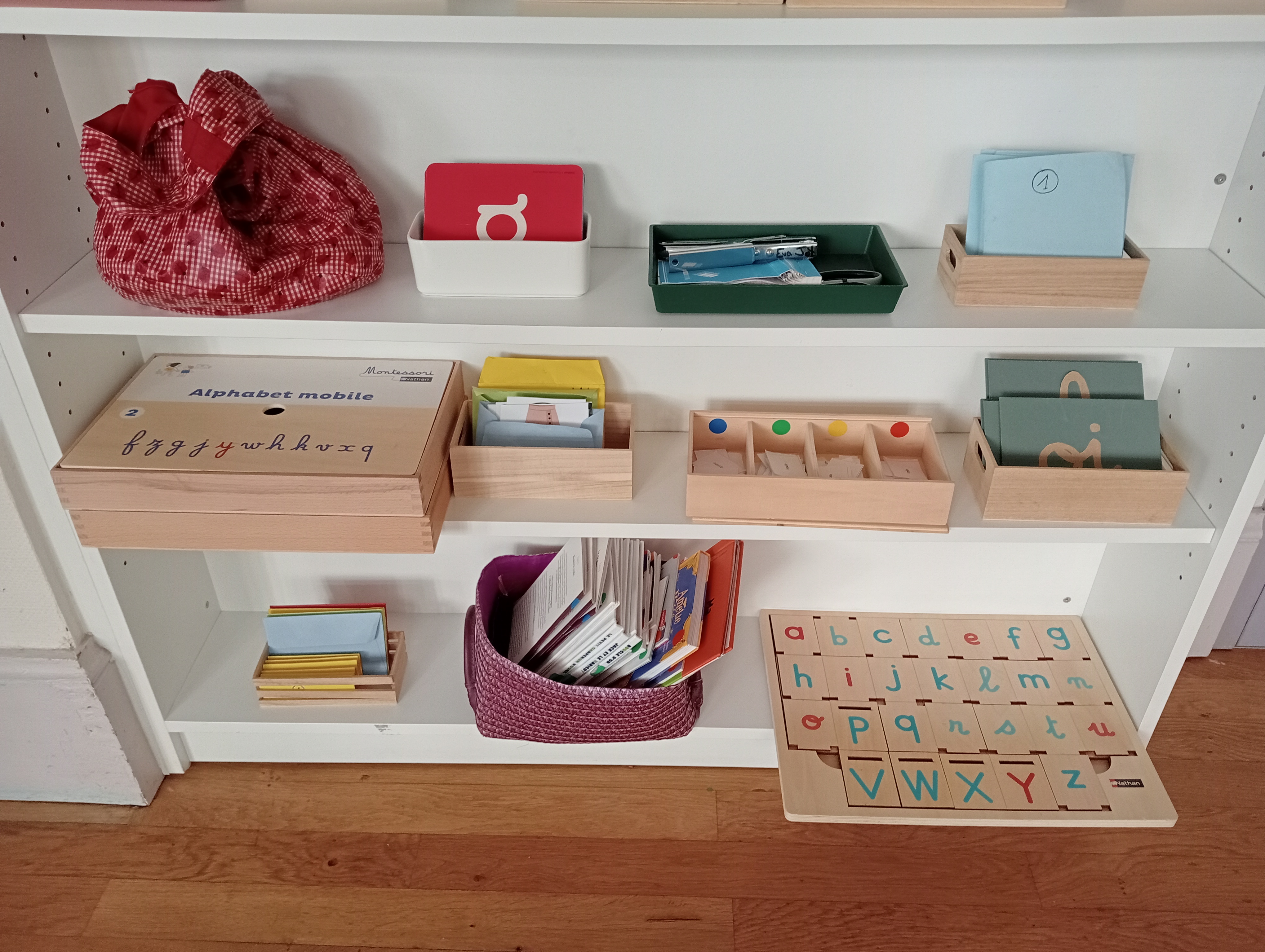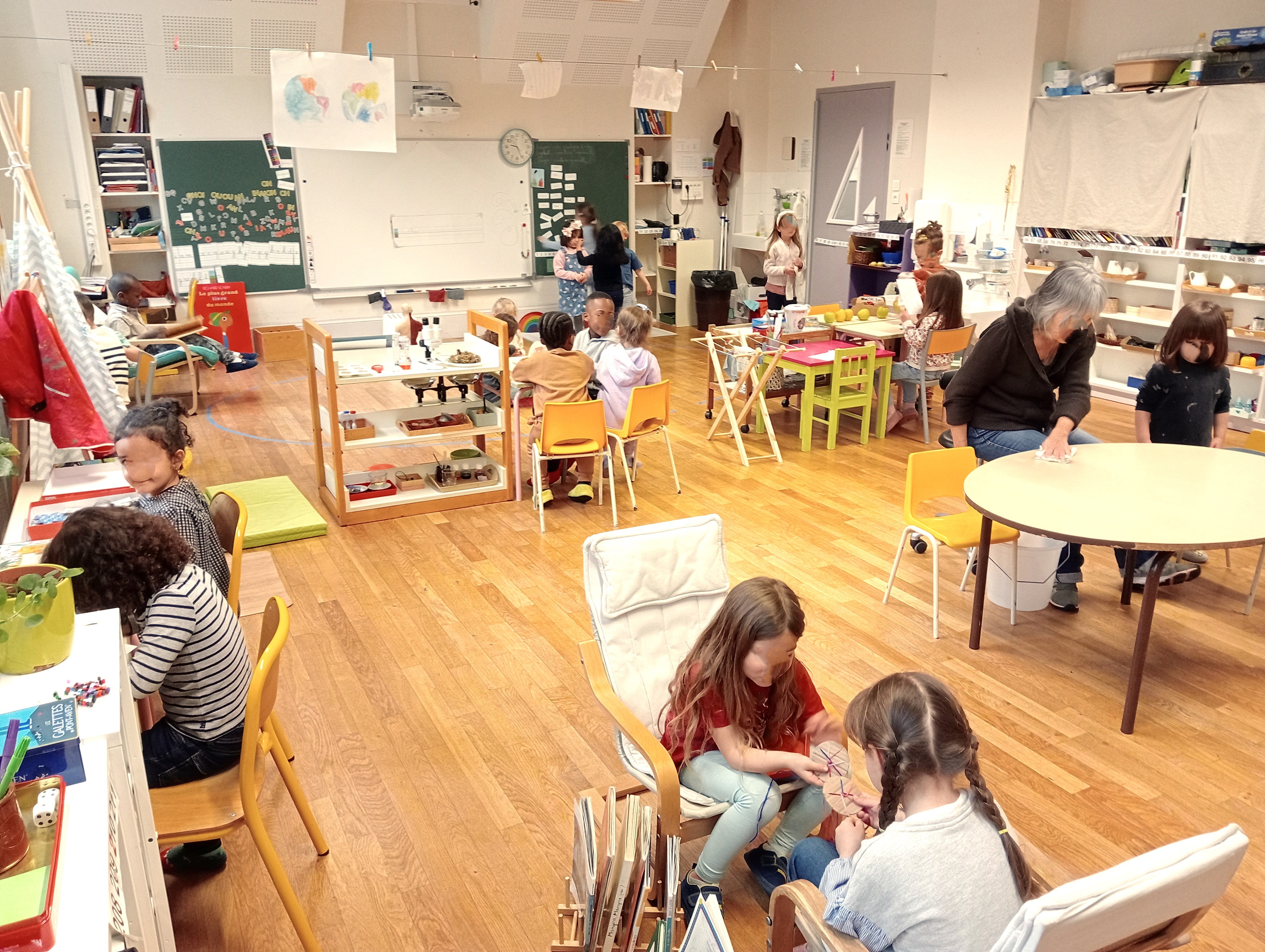 Auxquels il faut ajouter le meuble de phonologie (que vous verrez plus bas), et ceux de préparation à l’écriture, d’Arts manuels, et d’espace et logique. La classe est dégagée pour permettre une circulation aisée, et les enfants ont le choix de travailler sur table ou sur un tapis au sol.