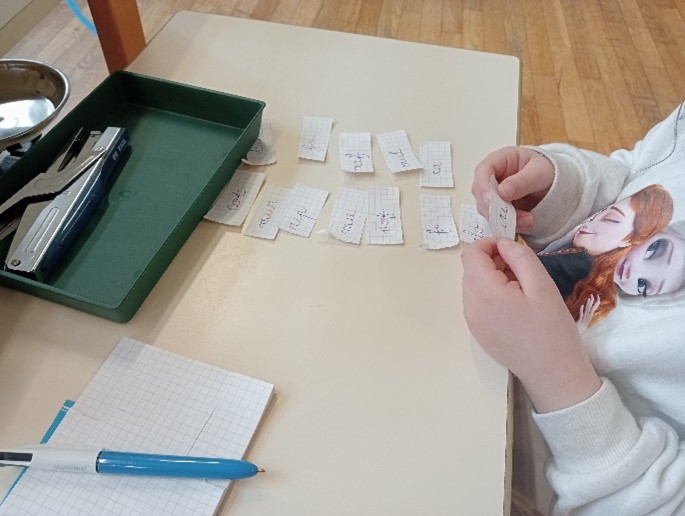 Je leur laisse le temps qu’il faut. Surtout je n’interromps pas cet énorme effet cognitif. Ils peuvent obtenir de l’aide de l’adulte ou d’un camarade uniquement pour leur rappeler un son oublié. Ils viennent me dire le mot une fois décodé. Ces petits papiers sont des trésors dont ils sont fiers.