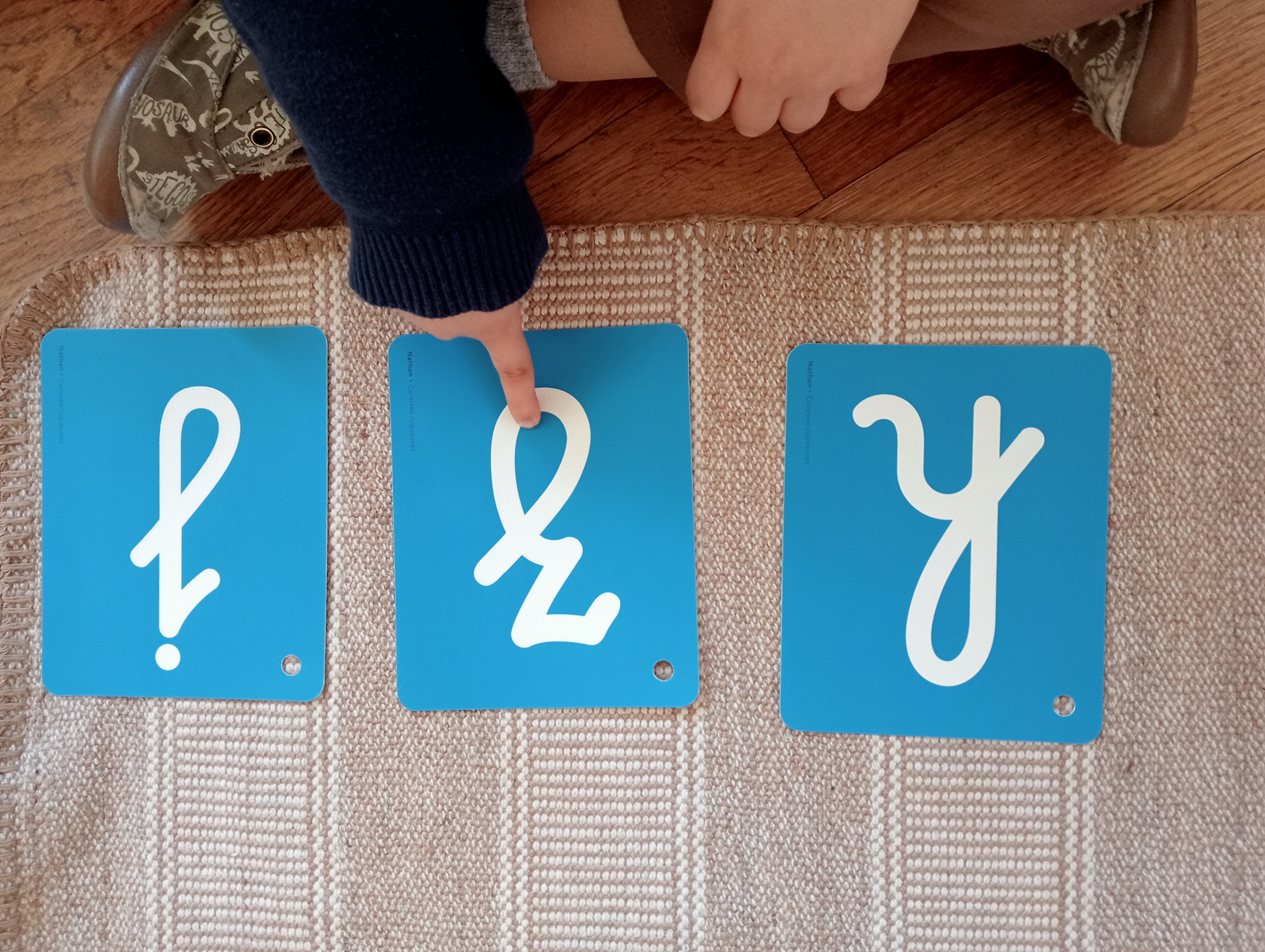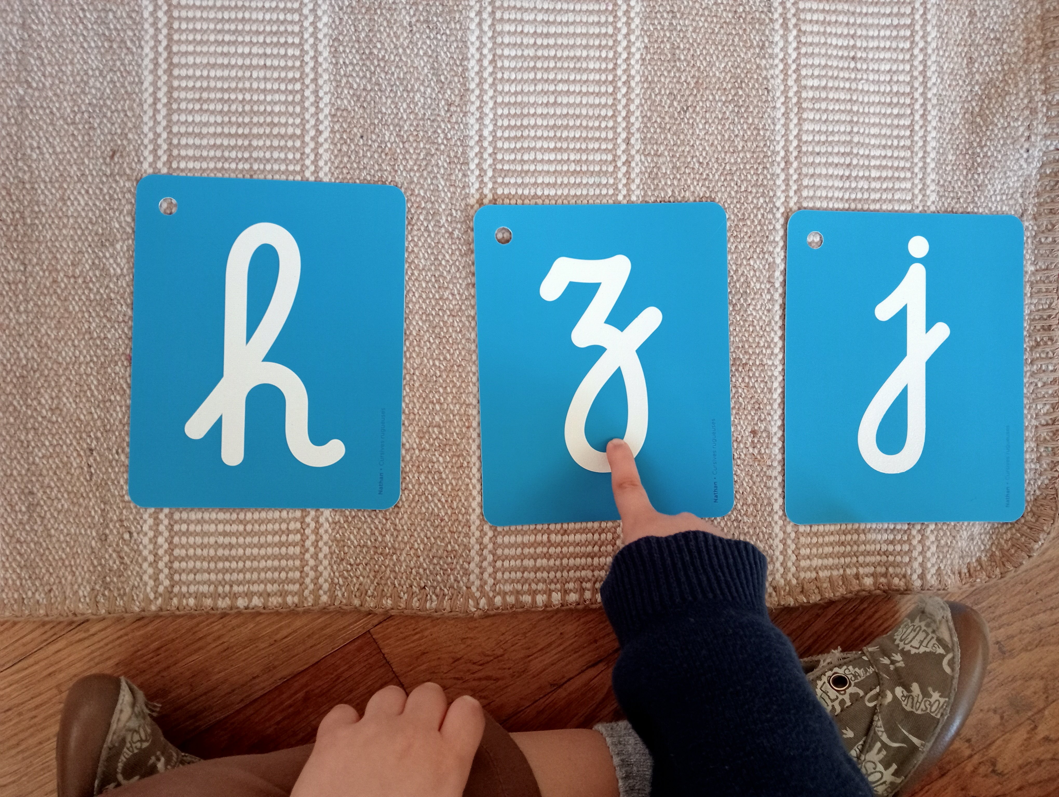 Une fois que les enfants entendent et identifient correctement les sons dans les mots, je mets en place l’apprentissage de la correspondance grapho-phonémique en utilisant des lettres cursives rugueuses, présentées par groupes de trois pour éviter la surcharge cognitive.