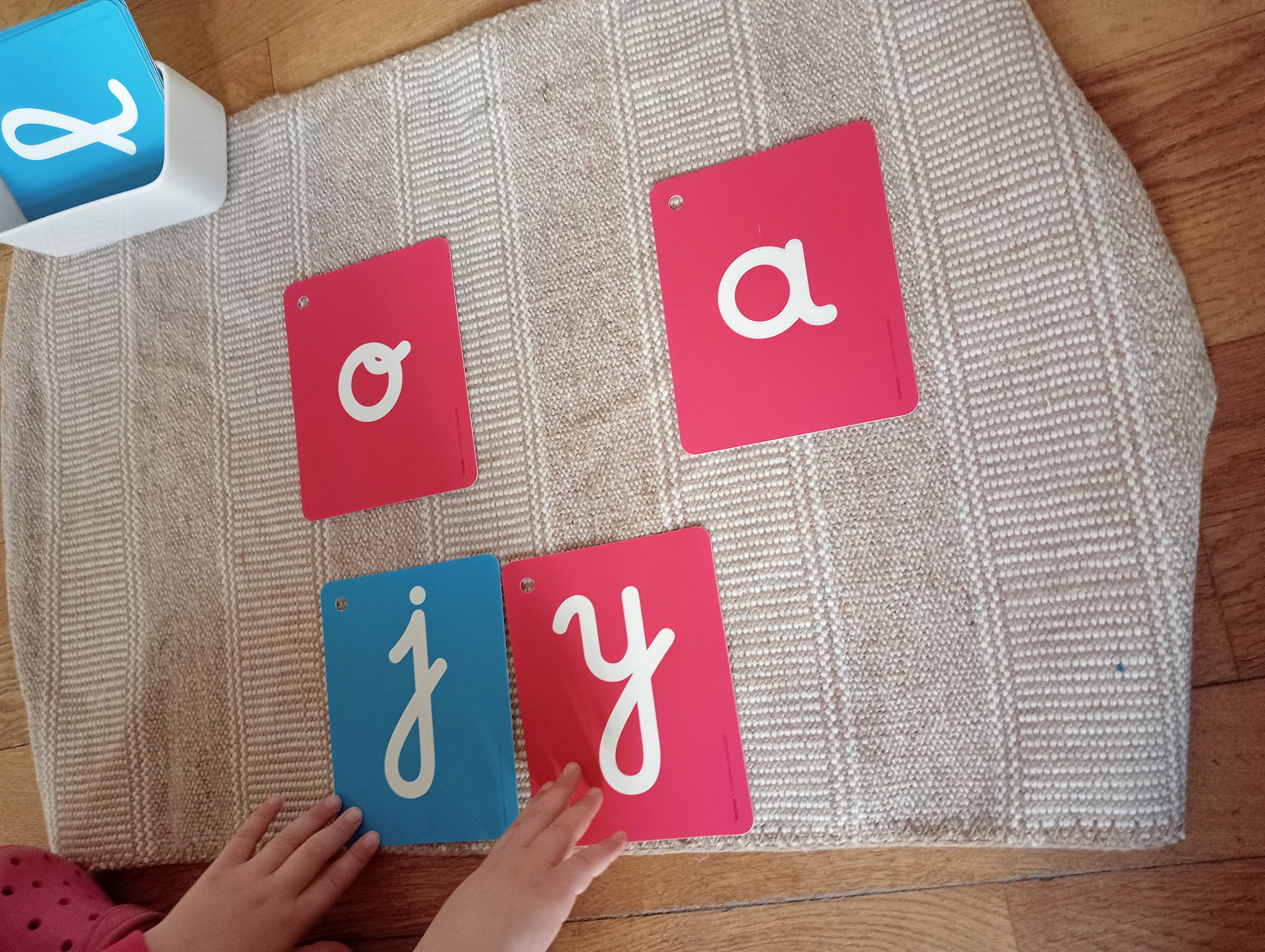 Enfin, je conclue avec un jeu de Kim où j’invite l’enfant à retrouver la lettre cachée. Ce jeu est apprécié des enfants et peut être également animé par d’autres enfants observant la présentation, ce qui favorise les interactions sociales et renforce l’apprentissage. Ils aiment reprendre cette activité en autonomie et s’enseigner les sons les uns aux autres.