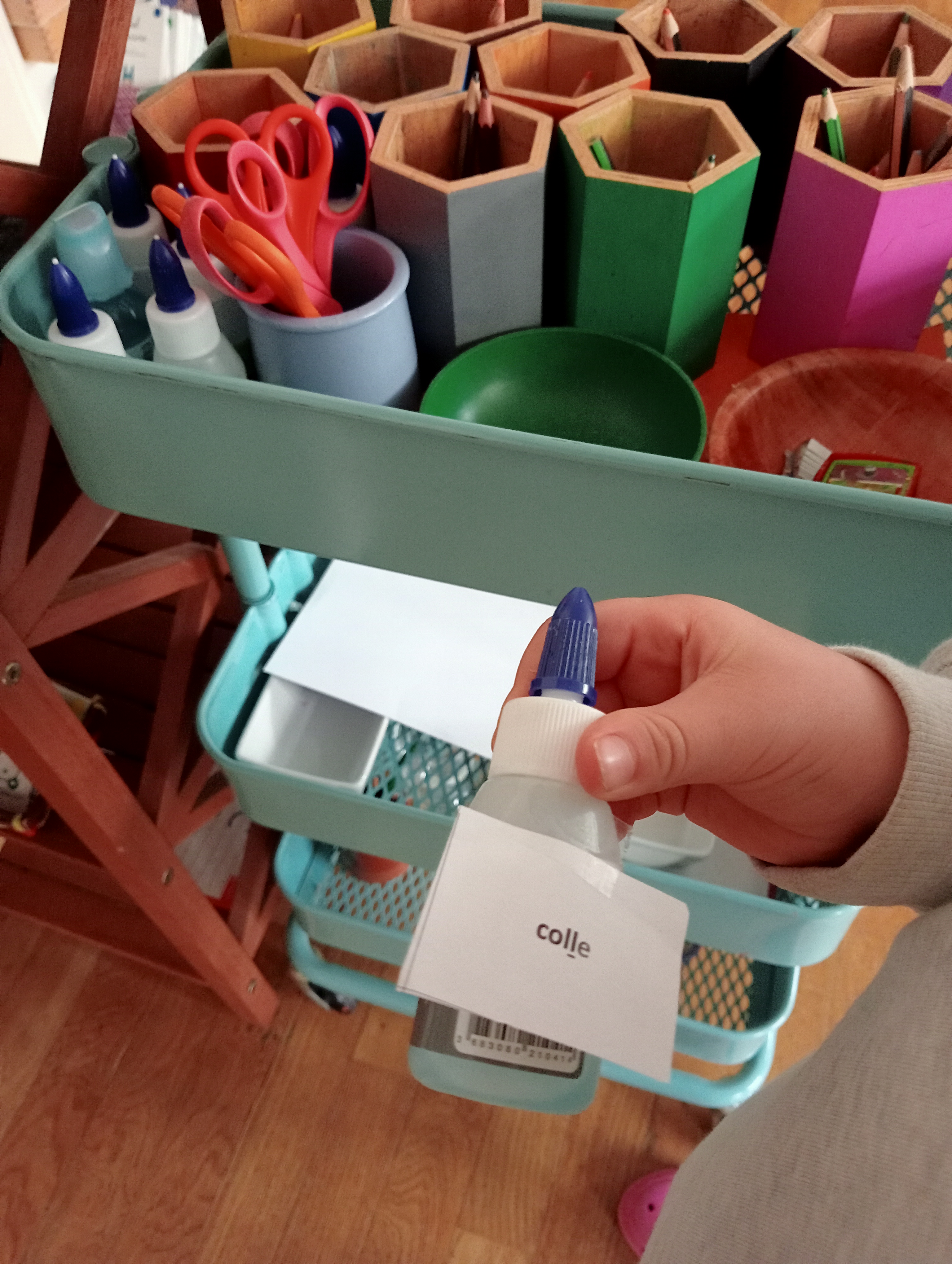 Les enfants décodent des mots et les collent sur les objets ou personnes correspondants dans la classe.