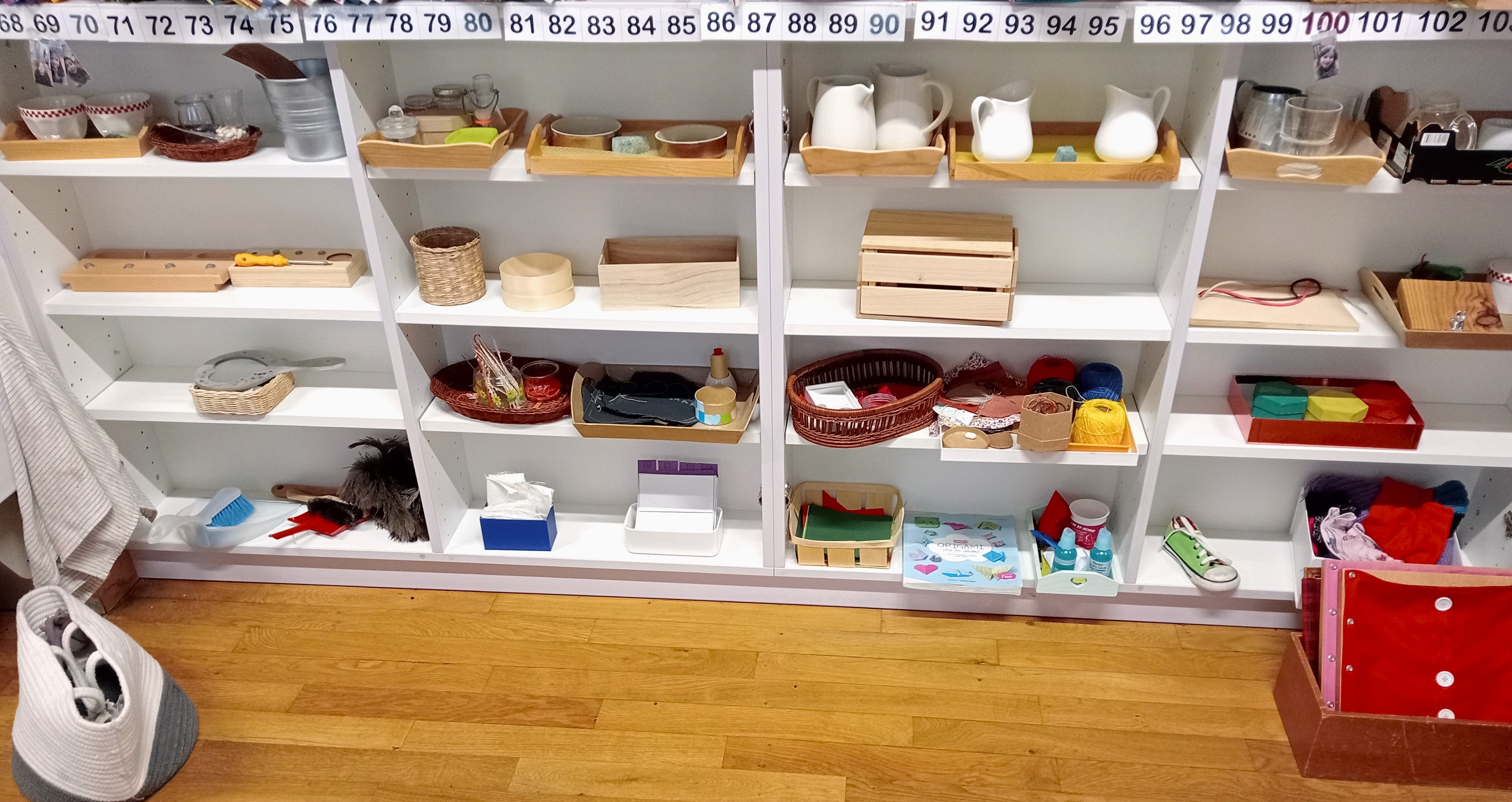 Pour favoriser l’autonomie, le matériel est accessible et adapté à la taille des enfants. Les ateliers sont organisés par domaines et disposés de manière logique, du plus simple au plus complexe, suivant un code couleur constant. Quelques exemples en image :