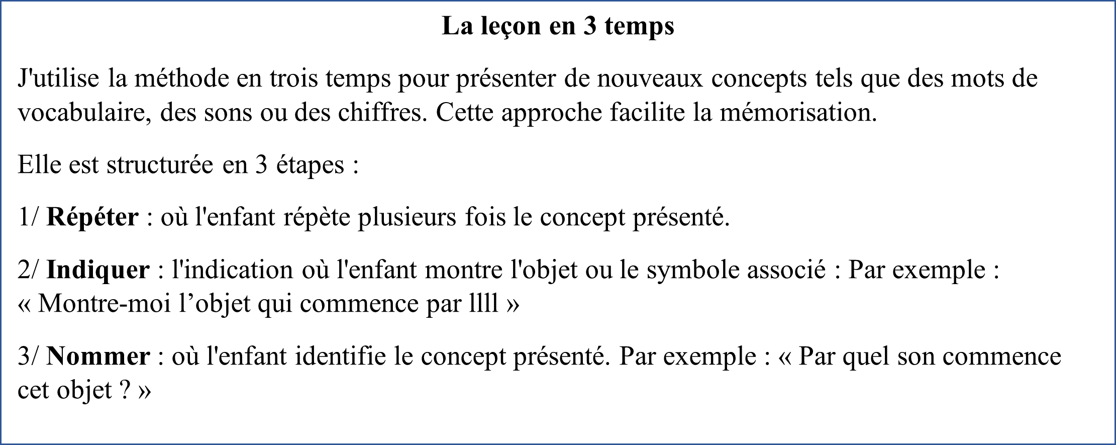 Ensuite, j’utilise la méthode en trois temps pour travailler ces 3 sons (voir encadré ci-dessus) [8].